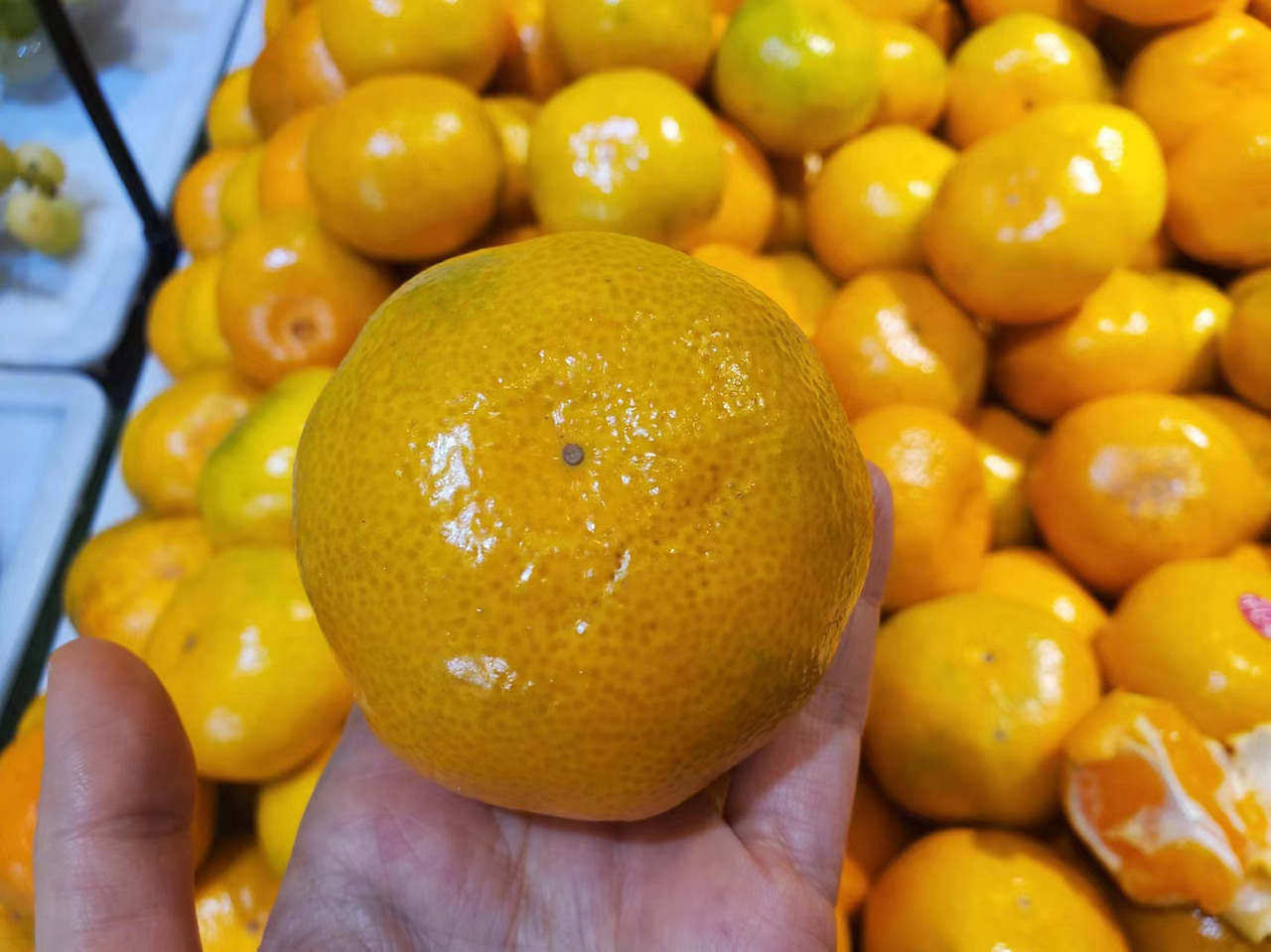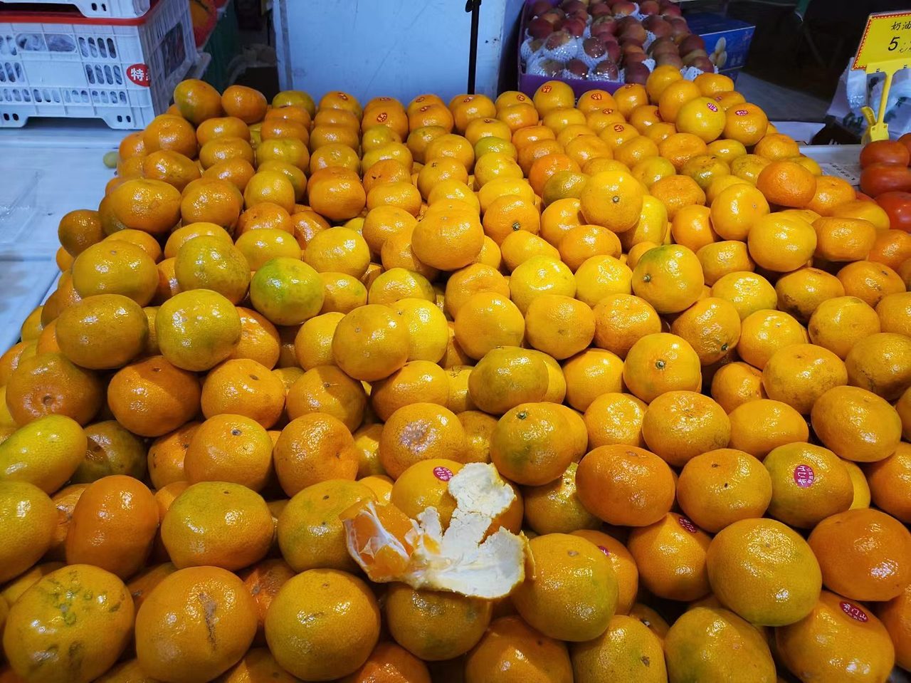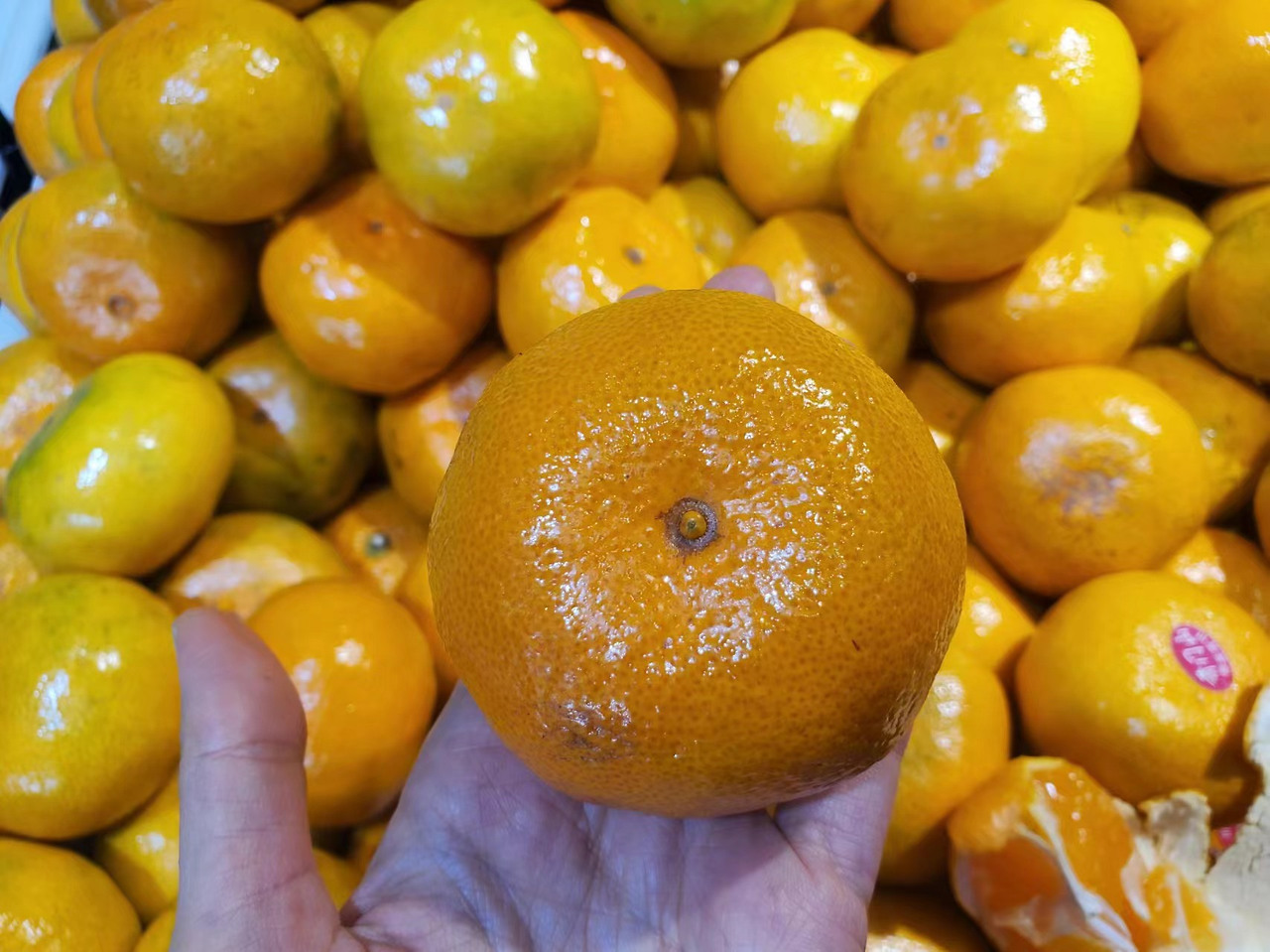 귤의 암수에 관한 정설(?)은 중국인 사이에선 거의 진실로 통한다. 하여, 귤이 산처럼 쌓인 매대에 귤의 배꼽을 살피는 소비자들이 수두룩하다. 그러나 어디든 영리한 소비자 위에 영악한 판매자가 있다. 수컷만 남는 매대의 해결책으로 몇 해전부터 스티커가 등장했다. 볼연지 같은 스티커가 정확히 배꼽을 덮고 있다.