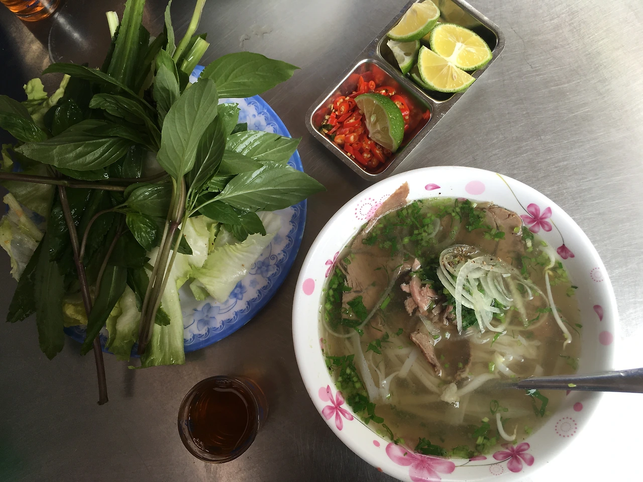 신선한 채소와 민트가 셀프 토핑인 길거리 쌀국수 한 그릇이 2,000원.