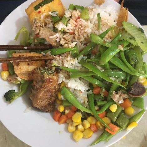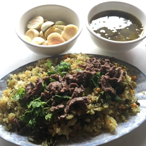 하장에서 호앙 수피라는 산골 마을로 가는 길에 버스가 한 읍내에 멈췄다. 버스에 외국인 승객은 나 혼자 뿐이었고, 영문을 모른 채 과자 부스러기나 먹고 있던 나에게 기사님은 밥 먹는 제스처를 취했다. 때는 점심시간이었고, 버스 기사님과 안내원은 물론 모든 승객들이 읍내의 한 식당에서 점심을 먹었다. 나는 눈치껏 빈자리에 앉아 사람들이 먹는 걸 가리켜 주문했다. 꼬불꼬불 산길을 가기 전 든든하게 먹었던 고기 볶음밥(국물과 피클까지), 2,000원.