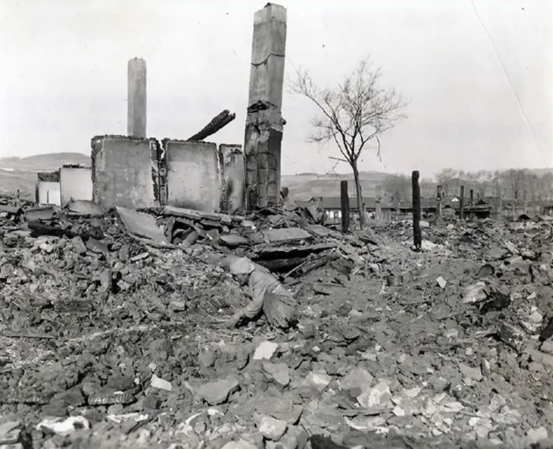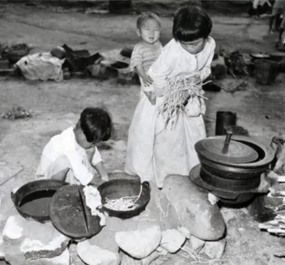 (좌) 폭파된 건물들 사이에서 무언가 찾고 있는 노인 / (우) 피난민촌에서 어린 소녀가 풀뿌리로 밥을 짓는 모습 / 출처 6.25 국가기록원