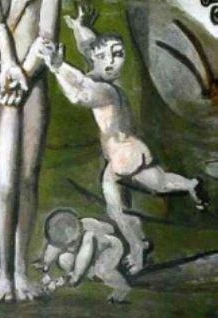 좀 더 자세히 볼까요. 울고 있는 한 아낙의 목을 꽉 끌어안고 있는 한 아기가 있습니다. '저 사람들 누구야?' 하며 겁을 먹은 얼굴로 누이의 팔을 다급히 붙잡고 있는 아이도 있고요. 그 뒤에는 아직 무슨 상황이 일어나고 있는 건지 모르는 듯 흙장난에 한창인 꼬마도 보이네요. 이 분명한 좌우의 대비는 일촉즉발의 긴장감을 불어넣는 동시에 비극적인 분위기를 한층 더 고조시킵니다.
