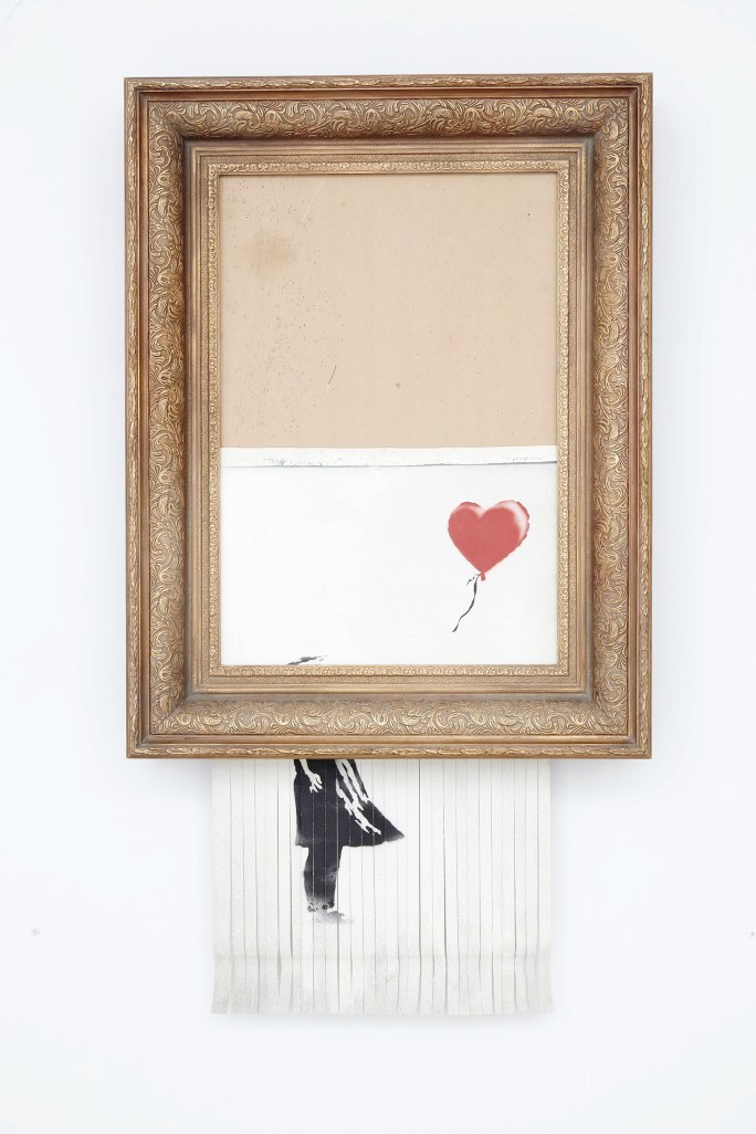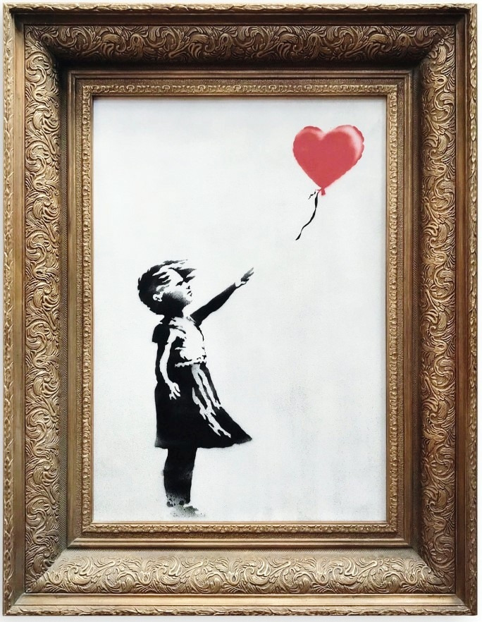 그의 대표작 중 하나인 <풍선과 소녀>라는 작품입니다. 2002년에 영국 런던 근교에 벽화로 처음 제작되었고 그 후로 많은 사람들의 사랑을 받으며 다양한 모습으로 꾸준히 변주 및 재생산되어 왔는데요. 이 작품이 2018년 소더비 미술 경매에서 104만 파운드(한화 약 15억)로 낙찰되자마자 경매장에 충격적인 사건이 일어납니다. 갑자기 작품 속 그림이 저절로 눈앞에서 파쇄되고 만 것이에요..