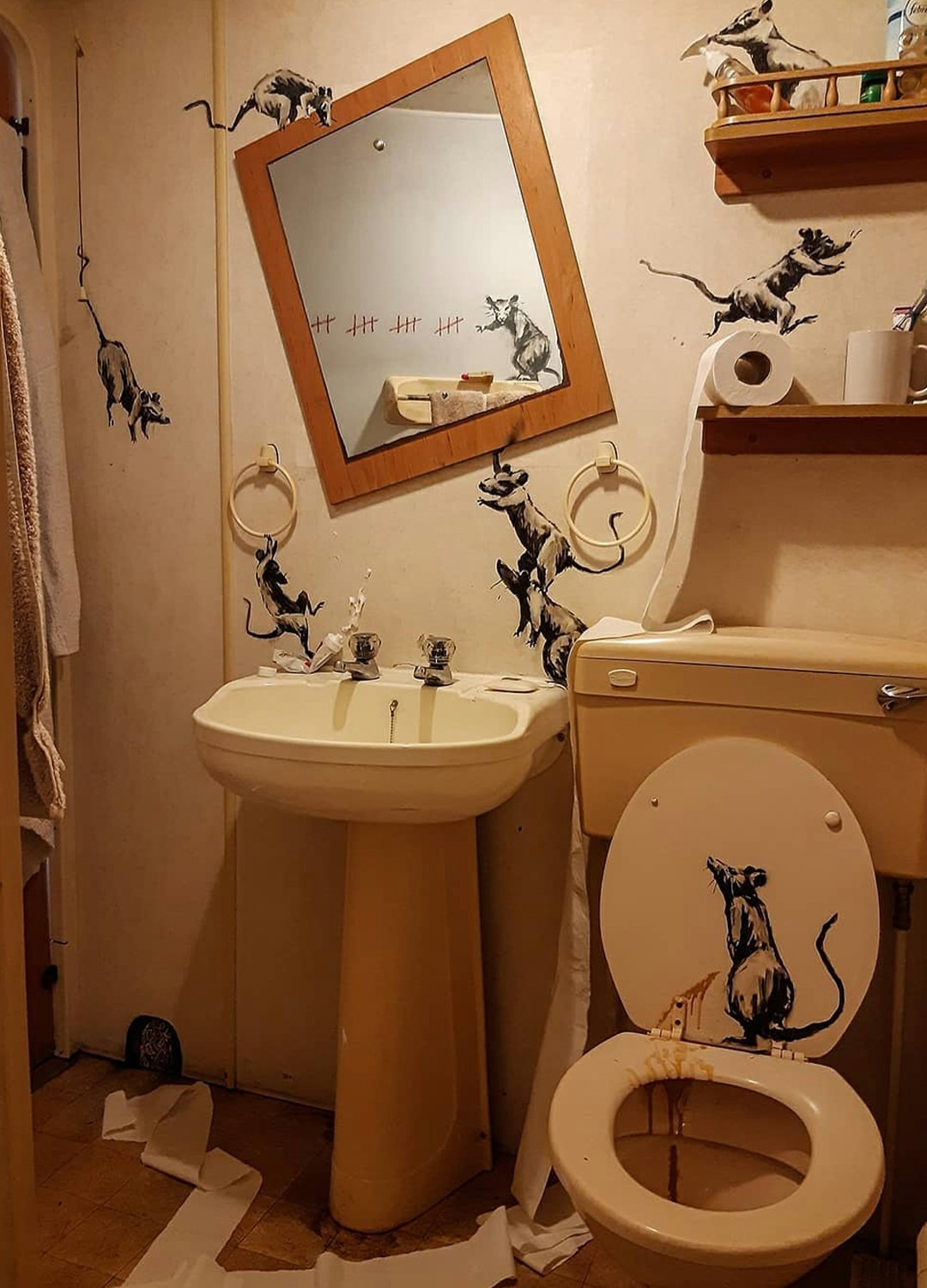 출처 Banksy 인스타그램한편 뱅크시도 코로나 사태를 빗겨가진 못했나 봅니다. 길거리 아티스트인 그도 사회적 거리두기를 지키고 있는지 뱅크시가 최근 인스타그램에 사진 몇 장을 올렸습니다. 어디 보자, 여긴 화장실인가요? 화장실을 놀이터 삼아 난장판으로 만들고 있는 건 다름 아닌 쥐..? 걱정 마세요. 진짜 쥐는 아니니까요! 그런데 이 쥐 가족들, 대체 무얼 하고 있는 걸까요?