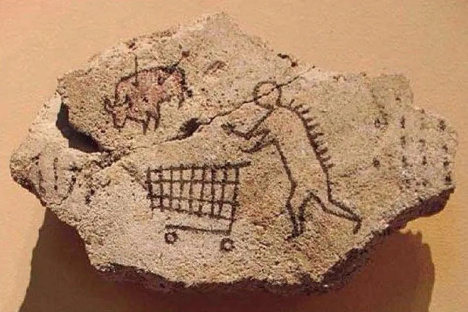 대영박물관에 유유자적 자신의 작품을 남기고 간 뱅크시. 사냥한 소를 담아가려고 하는 것일까요? 난데없이 등장한 원시시대의 쇼핑카트입니다.