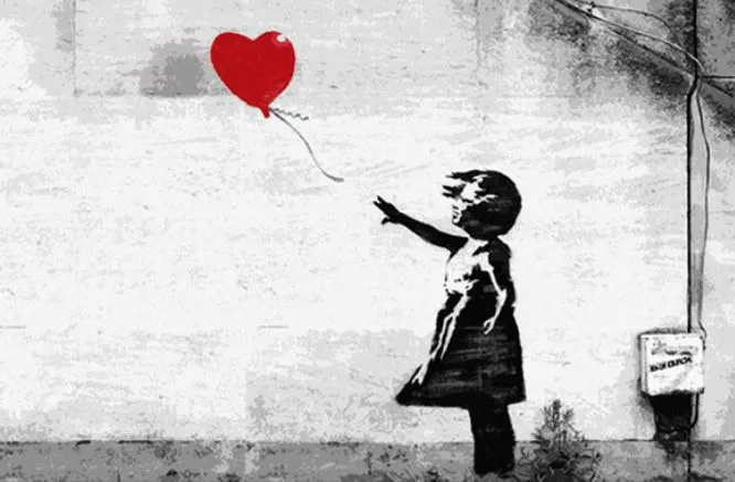 (좌) 2002년 벽화로 제작되었던 풍선과 소녀 / (우) 2018년 소더비 경매에 나온 <풍선과 소녀>