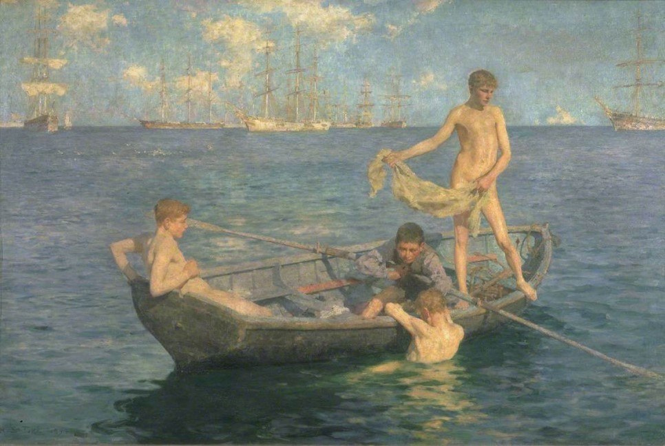 헨리 스콧 튜크, August Blue, 1893-1894 항구의 풍경, 바다, 해변, 보트, 고기잡이, 그리고 평화롭게 일광욕을 하거나 낚시하는 소년들.. 튜크는 이러한 소재에 매력을 느꼈다. 아마도 어릴 적 바다가 보이는 마을에서의 행복했던 추억이 크게 영향을 주었으리라. 그는 심지어 보트를 개조하여 그의 아뜰리에, 작업실로 만들고 그곳에서 작품을 구상하고 그려내기도 한다.