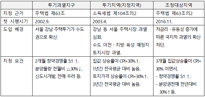 세 가지 규제지역 지정의 근거, 지정요건과 시행시기를 간략히 살펴보자.