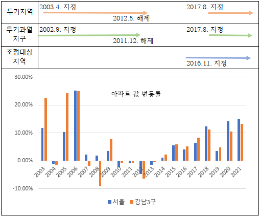 1962년 이후 수도권 인구 집중에 대응하여 정부는 대규모 주택 건설을 위해 대한주택공사(현 LH공사)를 설립하고, 대규모 택지개발, 신도시 건설 등 주택공급 확대를 꾸준히 추진해왔다. 만성적인 수요초과가 지속되는 가운데 집을 사거나 분양만 받으면 집값이 올랐고 전국적으로 ‘떴다방’, ‘복부인’ 등 투기세력이 만연하였다. 이러한 역사 속에 정부는 때때로 ‘부동산투기 억제 특별조치세, ‘분양가상한제’, ‘전매제한’. LTVᆞDTI 규제’와 같은 투기억제 대책을 내놓기도 했다. 이러한 정책은 대체로 특정 지역이 아닌 전국을 대상으로 시행했던 것이 특징적이다.