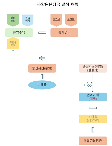 위 그림에서 눈치챌 수 있는 논리는, 조합원 분양가격을 낮추면 이에 따라 비례율도 낮아지게 되는 것이다. 이는 권리가액을 줄여 마침내 조합원 분담금을 더 내는 결과를 불러오는 것이다. 이것이 앞선 글에서 언급했던 ‘비례율의 마술’이다. 조합원들은 단순히 조합원분양가가 일반분양가보다 낮으면 언뜻 재건축 결실이 괜찮다고 느낄 수도 있다. 그러나 이것은 오해다. 이것에 관해서는 다음 글 ‘조합원의 실질부담’에서 설명하겠다.