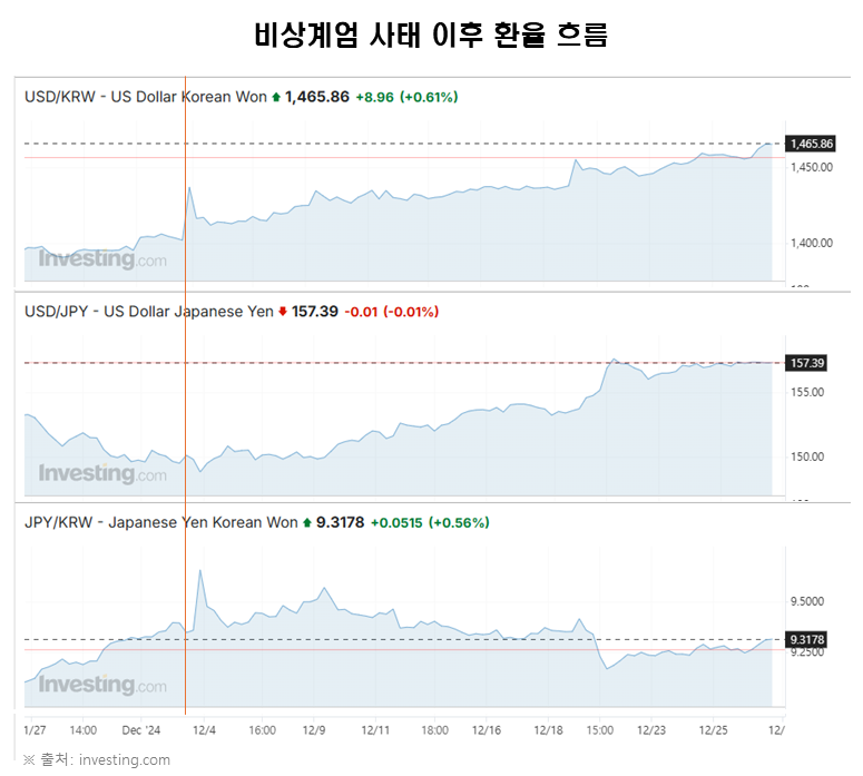 한편 달러-엔 환율은 원화에 비해서 그 상승속도가 빨라 오늘 현재 157.4원을 넘었다. 이에 따라 엔-원 환율이 930 초반 정도인데, 이는 계엄 선포 당시에 비해 약간 낮아진 수준이다. 바꾸어 말하자면 일본 엔화의 절하속도가 더 빠르게 진행된 것이다. 즉 한국 원화의 절하속도(환율의 상승속도)는 엔화에 못 미쳤다. 도중에 원화 가치 안정을 위해 한국 정책당국이 취한 여러 조치도 도움이 되었겠지만, 거의 한 달 동안 상대적으로 안정적 흐름을 보인 것은 환율 결정에 이번 정치적인 사건이 결정적인 영향을 주지 않았다는 사실을 반증한다.
