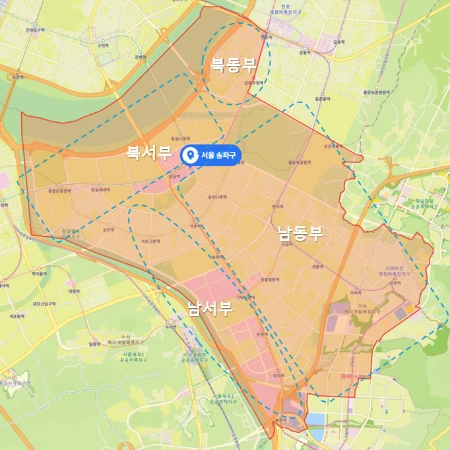 현재 송파구는 인구 65만 4천 명에 달하는 '메가시티'로서의 위상을 가지고 있으나, 내부적으로는 '잠실' 중심의 북부와 문정·가락·거여·마천을 포함한 남부라는 이질적인 두 도시가 공존하는 형태를 띠고 있습니다. 과거 재정 자립도 불균형 문제 등으로 행정구역 분리(분구)가 논의되기도 했으나, 현재는 『2040 서울도시기본계획』을 통해 이 두 지역의 기능을 통합하고 내부 불균형을 해소하는 방향으로 도시 계획이 선회되었습니다.