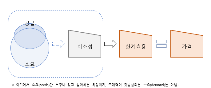 어떤 재화이든지 공급이 한정적이거나 적고 이에 비해 소요(needs)가 클 때 희소성이 발생한다. 이 희소성 때문에 소요가 있는 사람들끼리 경쟁하게 되고 이 중 끝내 그 재화를 차지하는 사람이 얻는 가치가 ‘한계효용(marginal utility)이며, 이는 그 시장에서 형성된 가격과 일치한다.*