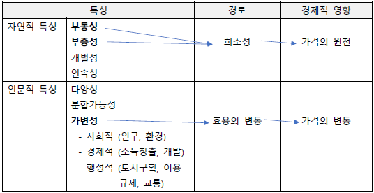 부동산은 통상 자연적 특성으로 부동성, 부증성, 개별성, 연속성 등을 가지는데, 이 중 부동성과 부증성은 자원으로써 희소성을 유발한다. 한편, 인문적 특성으로 다양성, 분합가능성, 가변성을 가진다. 가변성은 구체적으로 사회적 가변성(인구, 환경), 경제적 가변성(소득 창출, 개발), 행정적 가변성(도시구획, 이용규제, 교통)등으로 나뉘는데 이들 모두가 부동산 효용의 변동을 초래한다.