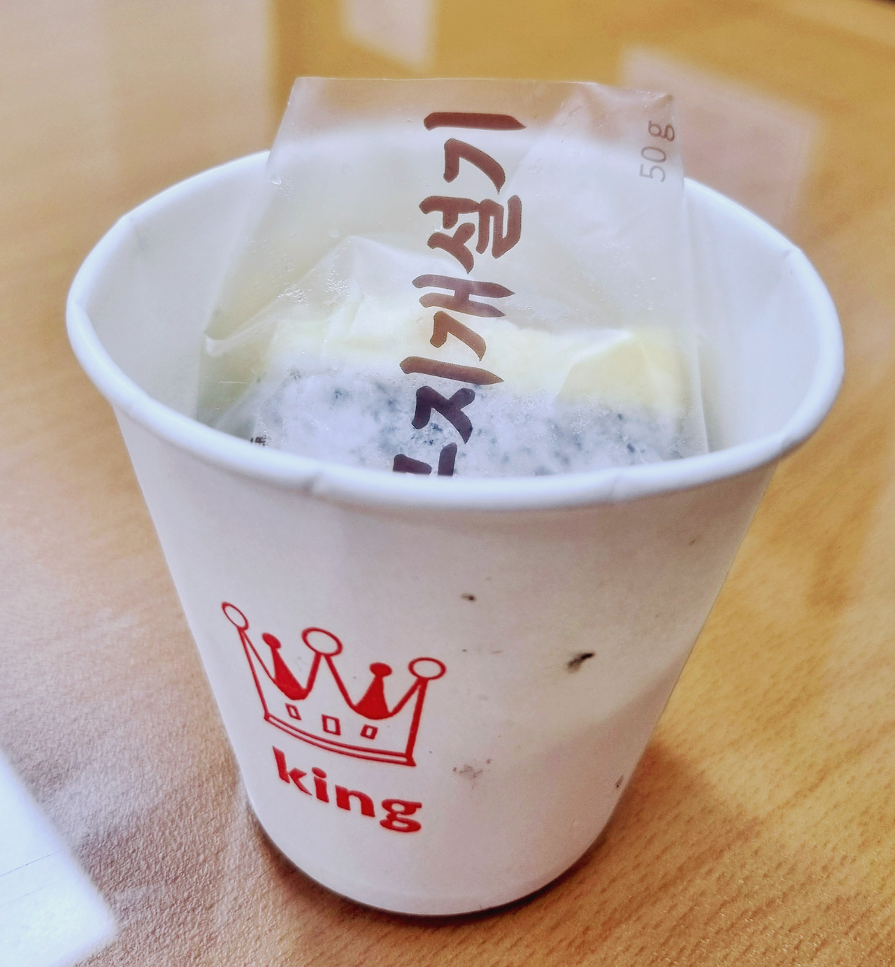 인성이가 내민 종이컵 속에는 무지개떡이 빼꼼 머리를 내밀고 있었다.