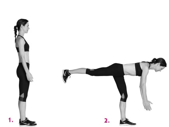 벽 옆에 일직선으로 바르게 서서 한쪽 어깨를 벽에 밀착시킨다. 다리는 벽에 붙이지 말고 골반 너비를 유지한다. 벽 쪽에 있는 다리를 뒤로 들어 올리면서 몸을 앞으로 숙여서 T자 모양이 될 때까지 내려갔다가 다시 제자리로 돌아온다. 이때 몸으로 계속 벽을 밀어내는 힘이 있어야 버티는 다리 엉덩이 옆쪽에 있는 중둔근에 힘이 잘 들어간다. 무릎은 살짝 구부린다.