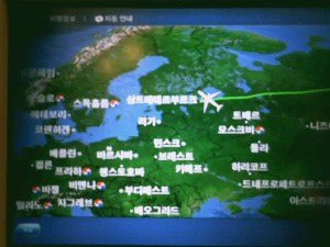 한국어로 표시된 기내 화면에는 비행 경로가 선명하게 표시되어 있었고, 비행기 아이콘은 상트페테르부르크로 향해 날아가고 있음을 보여주었다.