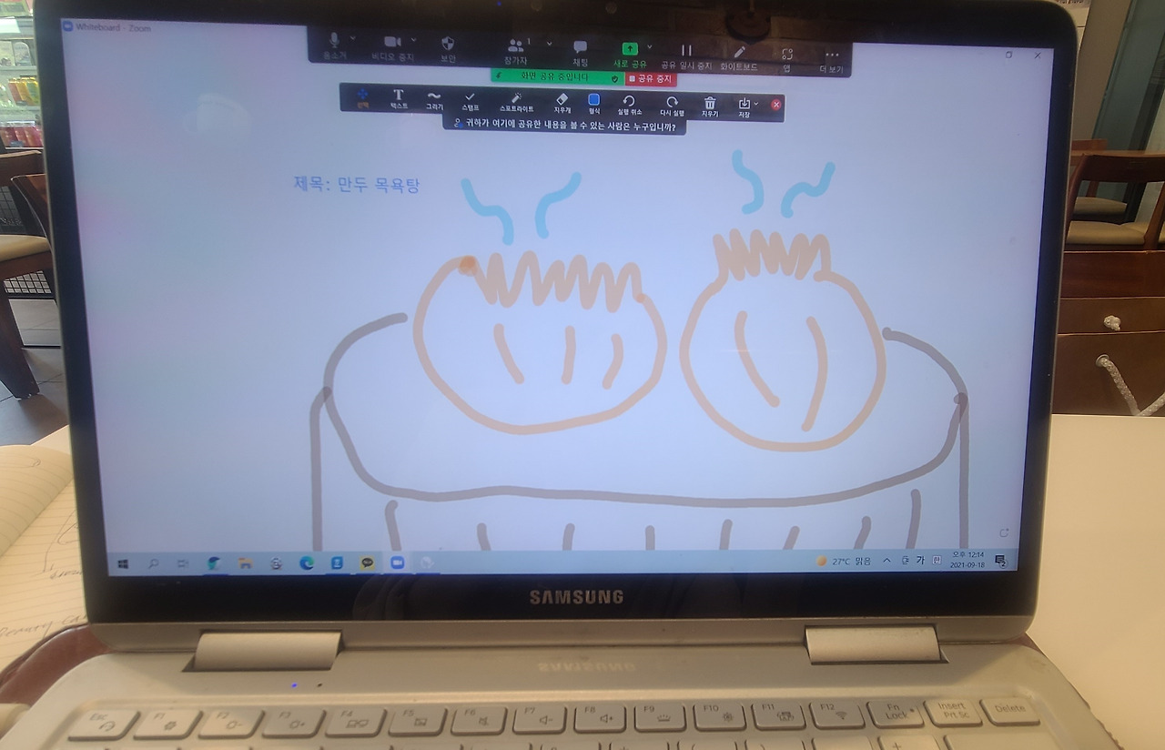 “화면 공유를 누르고 주석으로 들어가 화이트보드를 클릭해. 그럼 모든 아이의 화면에 화이트보드가 떠. 여기에 같이 그림을 그릴 수 있어. 릴레이로 그림 그리는 것도 재미있어.”