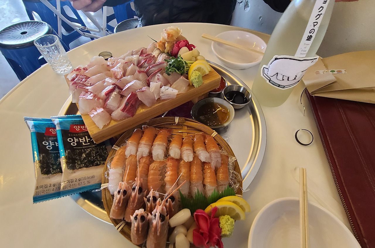 우린 만나자마자 밥 얘기부터 한다. 그렇다, 우리가 제주에서 만난 목적은 밥이다. 혼자서는 먹고 싶은 메뉴를 먹을 수 없으니 각자의 여행 중에 잠깐 만나 같이 식사를 하기로 한 것이다. 자리를 잡고 각자의 무거운 배낭을 발아래 내려놓는다. 회와 딱새우를 주문하고 사케도 한 병 시킨다. “여기까지 오느라 수고했어!” 말하며 첫 잔을 경쾌하게 부딪쳤다.