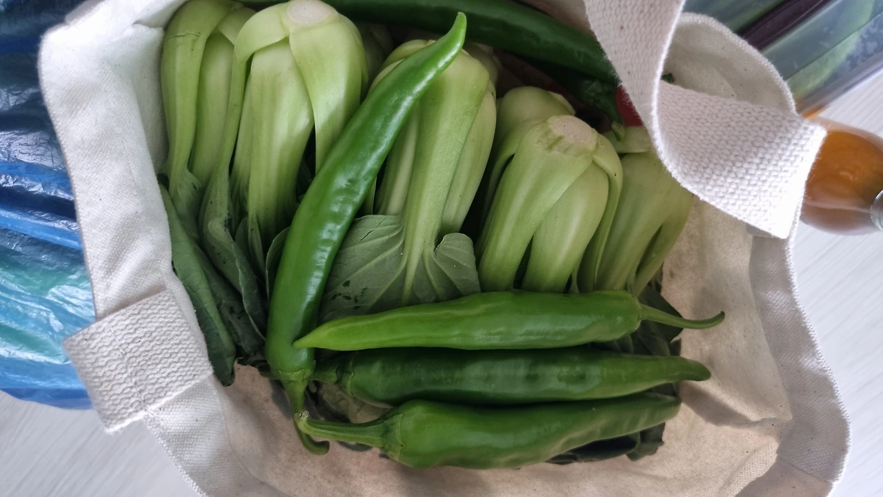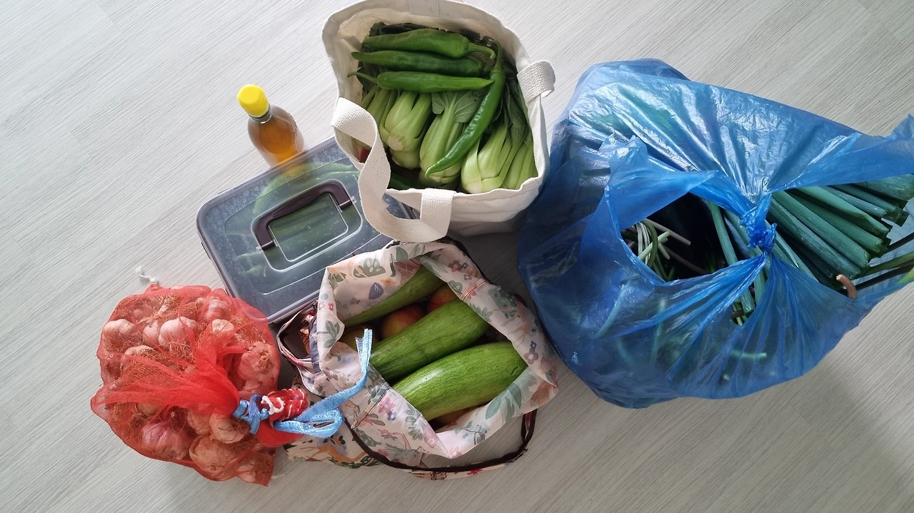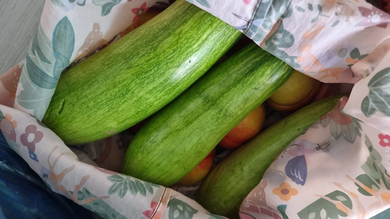 항상 가는 야채 사장님, 아침에 채소를 밭에서 수확해서 오셔서 항상 싱싱하다. 오이는 고부라진 게 더 맛있다며, 상품성이 없으니 더더 많이 덤을 주신다. 사진 속 에코백 하단에 오이가 그 위에 토마토, 그 위에 청경채가 담겨있다.