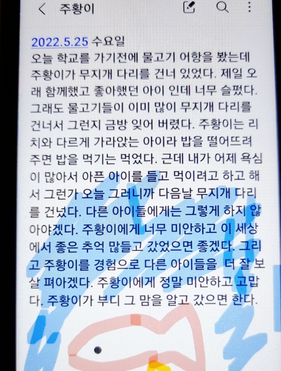어제 집에서 키우던 물고기 한 마리가 죽었다. 스무 마리가 넘는 작은 백운산 물고기들 중에서 주황이라는 이름을 가진 물고기였다.
