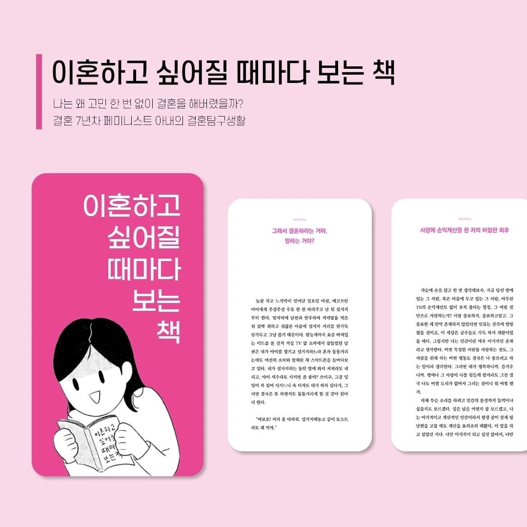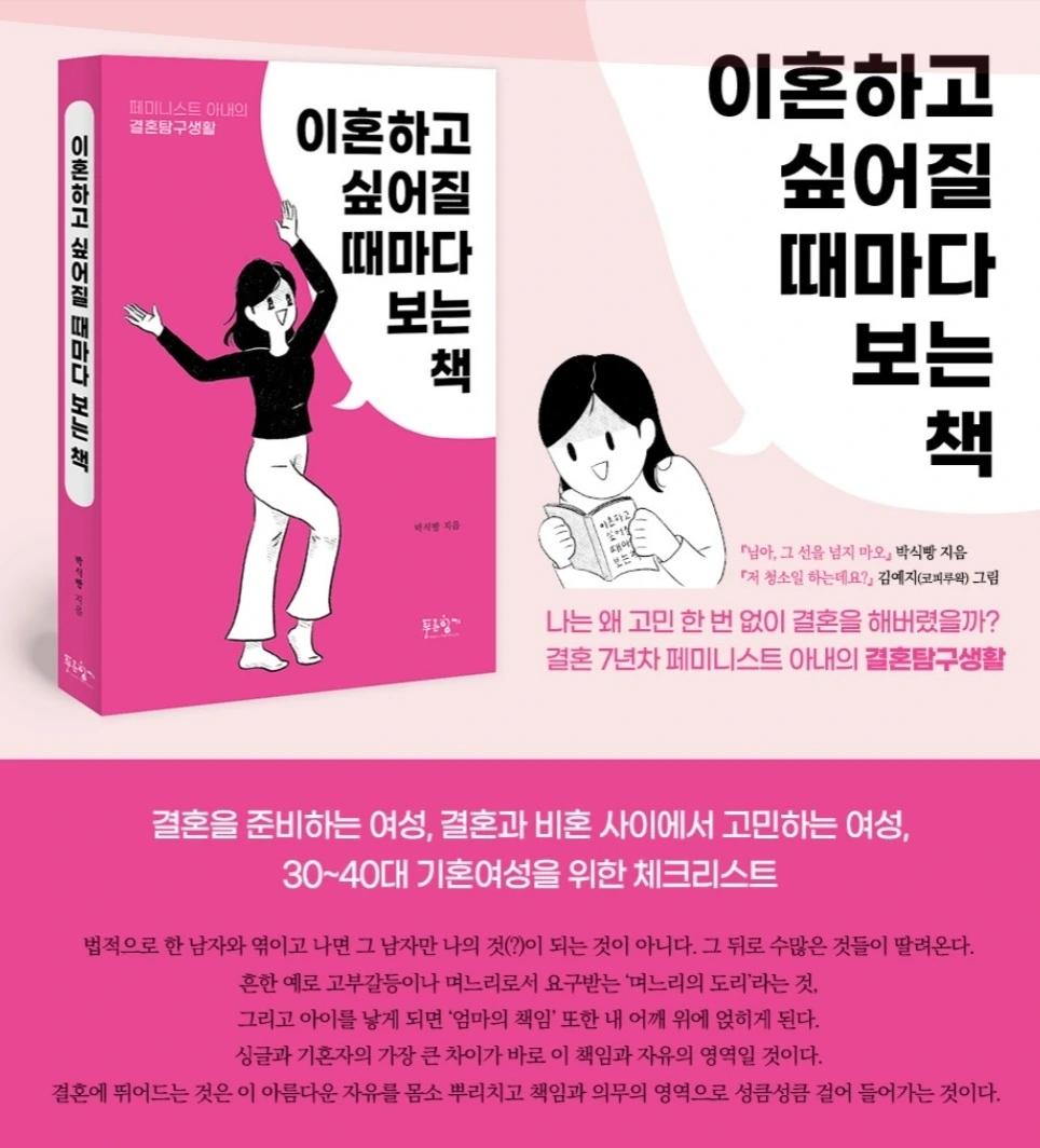 자전적 고부갈등 경험에 관해 쓴 나의 첫 책 『님아, 그 선을 넘 지마오』가 출간되고, 몇 달이 지나서야 책을 제대로 펼쳐보았다. 그런데 분명 당시엔 최선을 다했던 내 글을 보면서 나의 머 릿속은 새로운 물음표로 가득 차 버린 매우 곤란한 상황이 되어 버렸다. 내 책을 페미니즘 책으로 홍보하고 있으면서, 어째서 나 는 페미니스트에게 이다지도 박하고 억울하고 시시한 결혼제도 에 대해서 한 치의 의문도 가져본 적이 없었나. (물론 결혼하지 않았다면 이 아이도 존재하지 않았겠지만) 하나뿐인 소중한 딸아이를 페미니스트로 키우고 싶어 하는 엄마이면서, 내 엄마의 모진 시집살이를 30년 가까이 보고 살아온 산 증인이 면서, 도대체 왜 나는 고민 한 번 해보지 않고 서른 살이 되자마 자 유부녀의 길로 뛰어들었나. 이것은 쓰지 않고는 풀리지 않을 의문이었다.