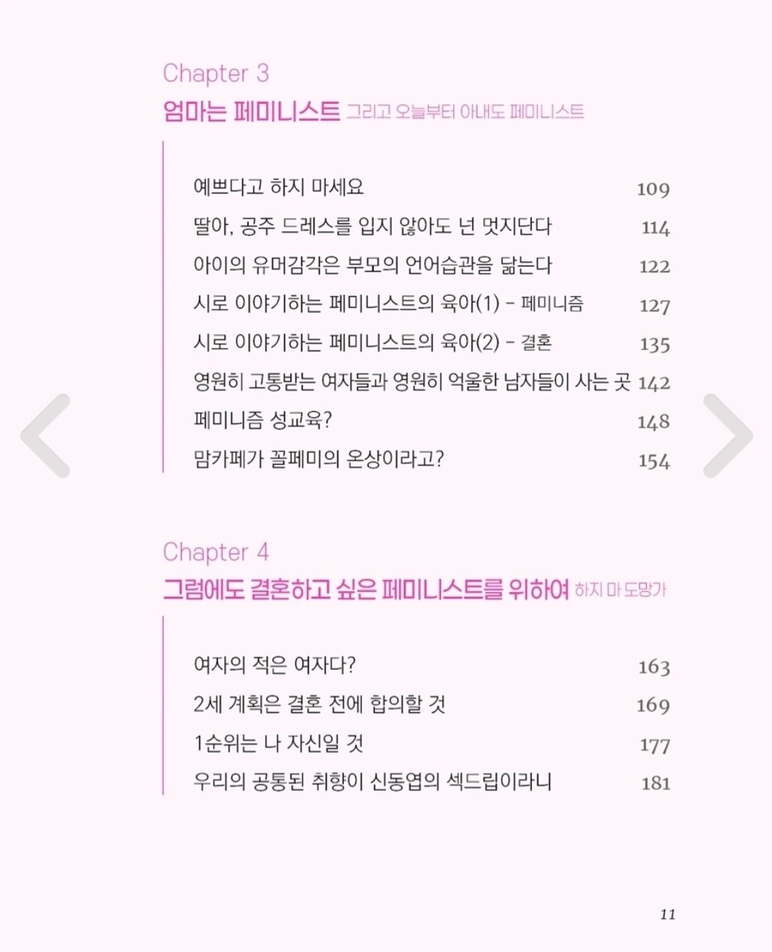 어쨌든 나는 한 남자와 이미 결혼이란 걸 해버렸고, 아이도 낳았다. 틈만 나면 싸우고 울고불고 진상이 되기도 하지만, 아직까지는 이혼이란 걸 하지 않고 어찌어찌 살고 있다. 게 다가 참으로 안타까운(?) 것은 격한 고부갈등을 겪고 나서, 그 리고 딸을 키우면서 스스로가 페미니스트임을 깨달아버렸다 는 것이다. 그것은 수많은 싸움의 시작을 뜻하기도 했다. 이왕 해버린 결혼, 남편을 나와 같은 페미니스트로 만드는 것도, 내 아이를 훌륭한 페미니스트로 키워내는 것도 내 삶에 추가로 주어 진 과제가 되어버렸다. 그것은 험난한 과정일 것이다. 하지만 할 수 있을 것 같다. 그 방법을 찾기 위해 지금도 이 글을 쓰고 있다.