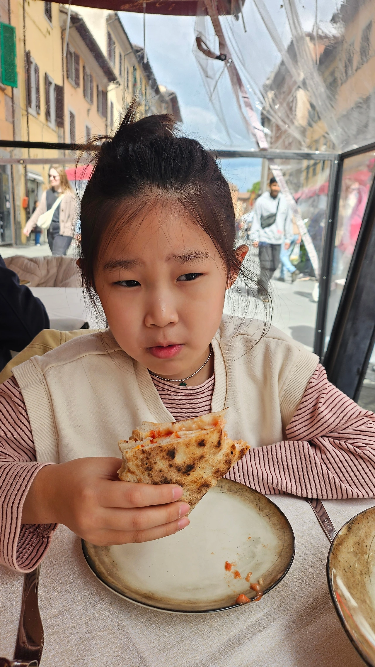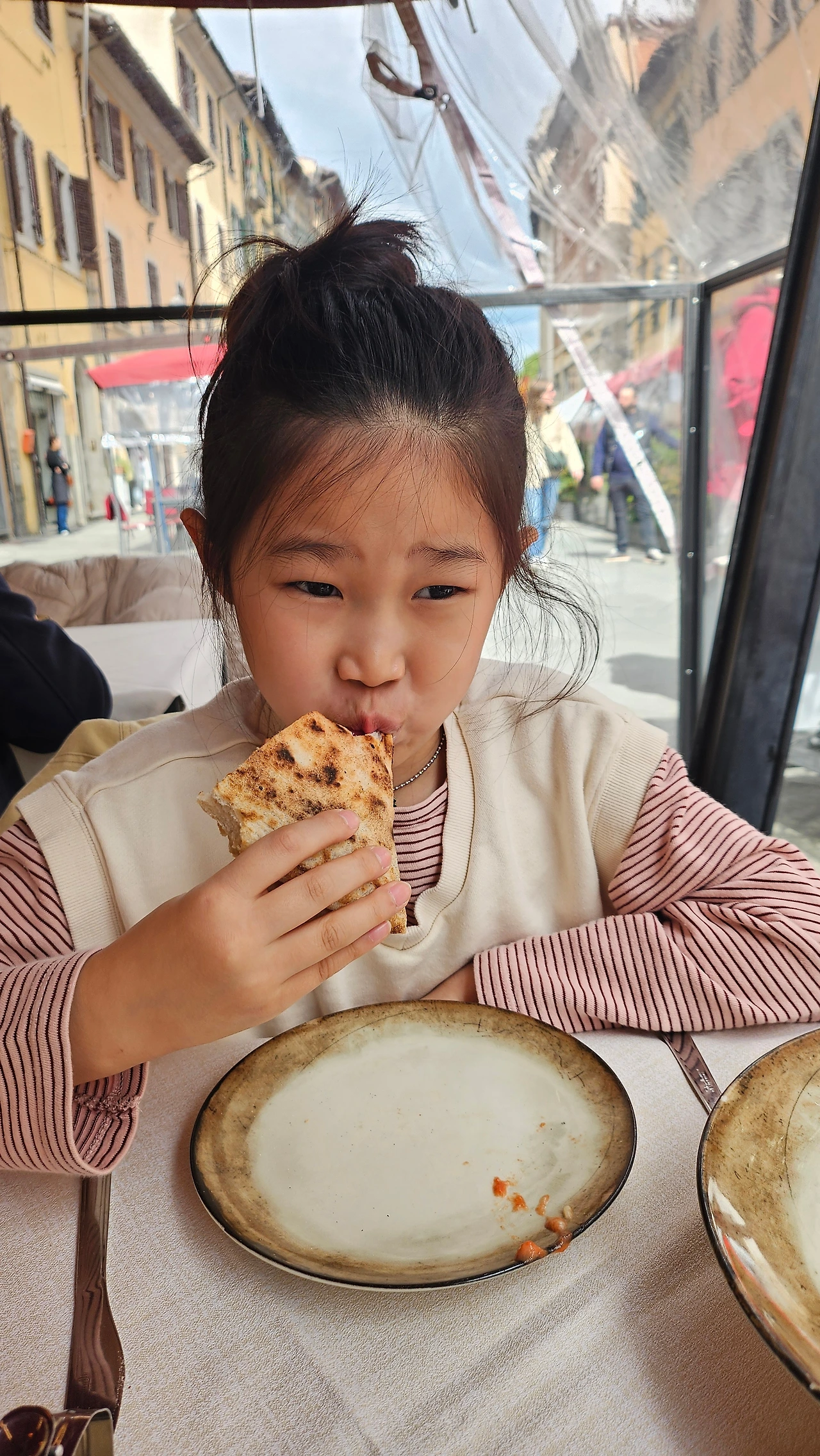 한편, 토마토케첩 포함하여 생토마토는 물론이오, 음식 재료로 쓰이는 모든 토마토를 극혐하는 우리 집 초딩은 이탈리아에 왔으니 어쩔 수 없이 살기 위해 그것을 먹게 되었다. 피자 도우 젤 아래 바르는 토마토 소스마저 싫어하는 까탈스러운 그녀가 피자와 토마토 베이스 파스타를 먹게 된 것이다.ㅋㅋ 현지에서 먹으니 한국에서 먹던 한국화된 피자, 파스타보다야 당연히 맛있기도 했을 터다.