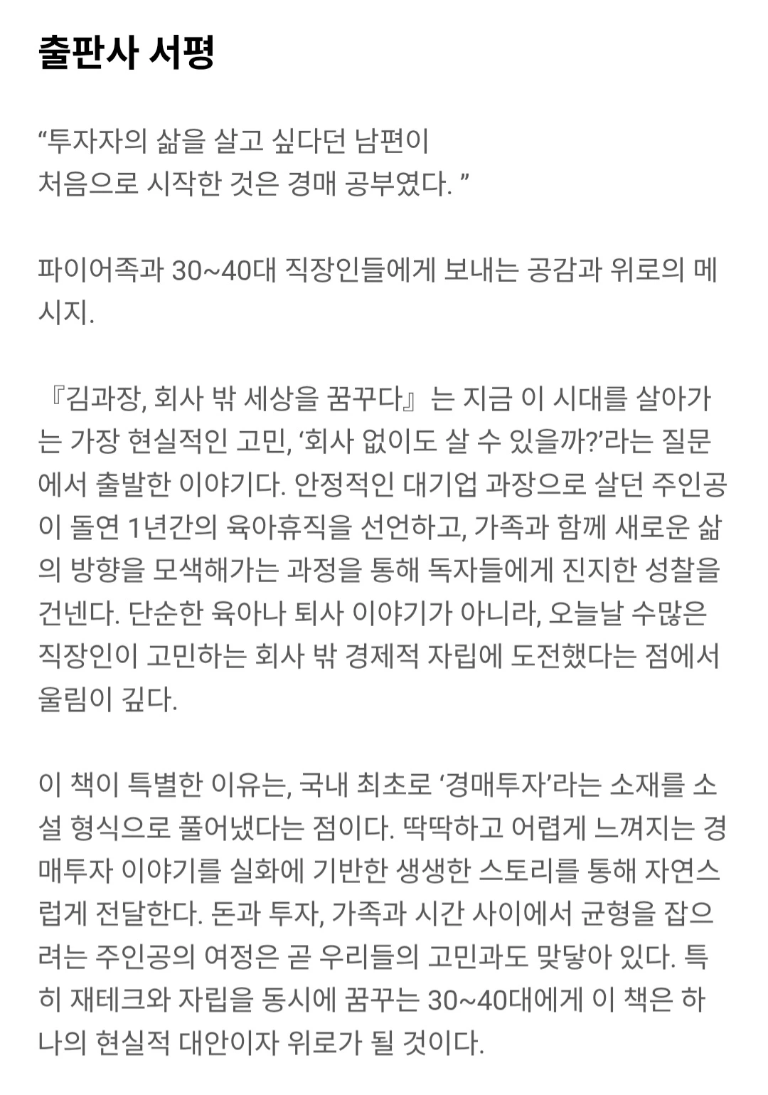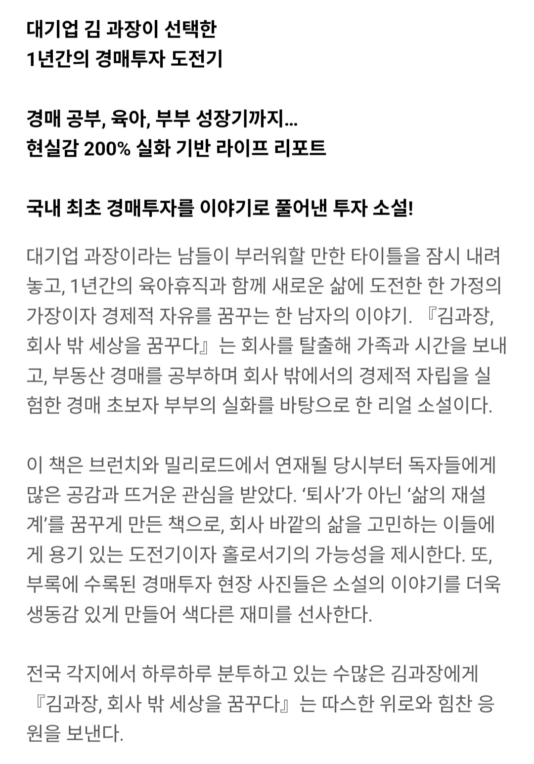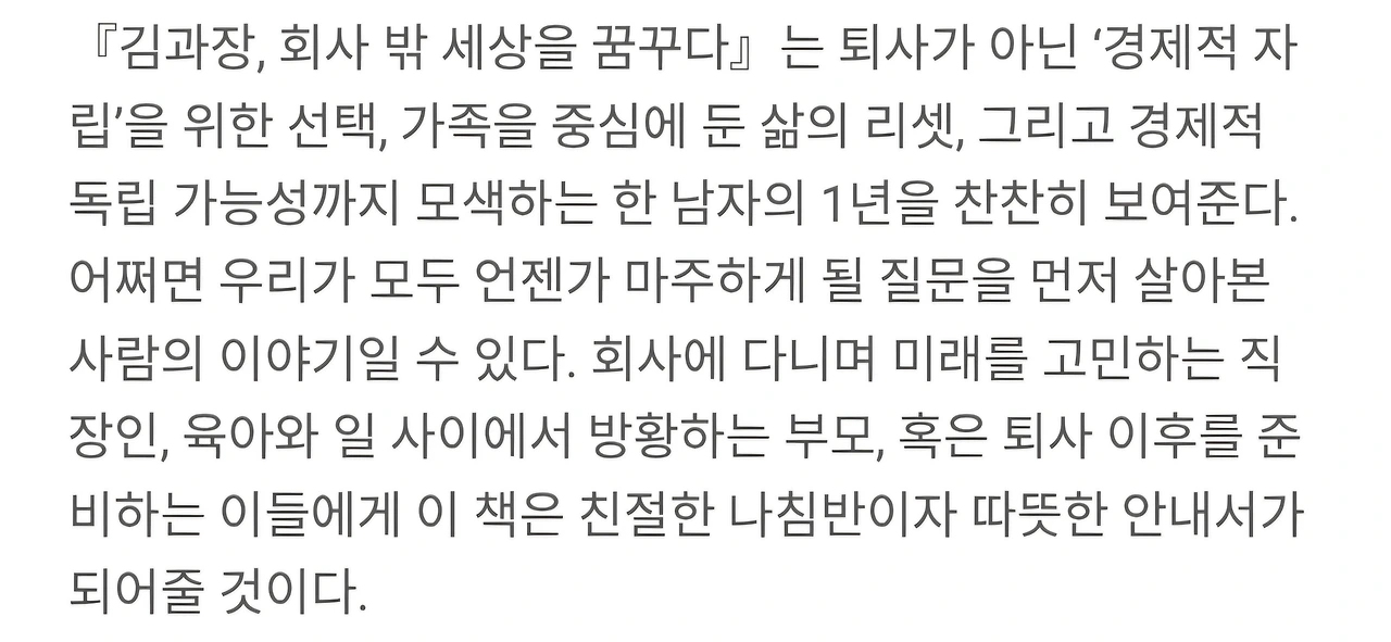 김과장, 회사 밖 세상을 꿈꾸다 | 사표 대신 육아휴직, 진짜 삶을 살아보기로 했다! 대기업 김 과장이 선택한 1년간의 경매투자 도전기 경매 공부, 육아, 부부 성장기까지… 현실감 200% 실화 기반