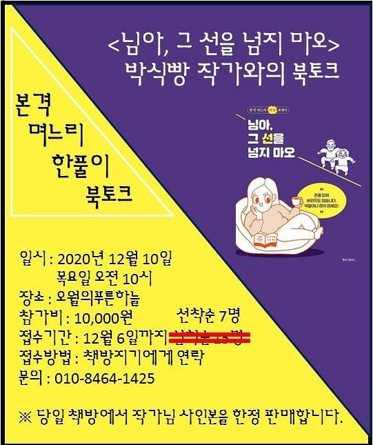본격 며느리 한풀이 북토크!!코로나 확진자 수 증가로 인하여, 모집인원을 반으로 줄이고 사회적 거리두기 ...