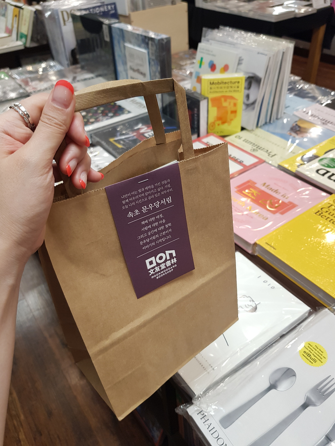 그렇게 밀크티 테이크 아웃 후 나는 나름 속초의 핫플인 '문우당 서림'으로 발걸음을 옮겼다. 독립서점으로 유명해 어떤 책을 파는지 어떻게 다른지 궁금했기 때문이다. 서점은 2층으로 되어있었는데 내가 찾은 차이점은 책의 종류도 그렇겠지만 판매하는 책에 직원들의 추천사가 있다는 점이다. 또 책을 구매하면 종이백에 포장을 해주는데 이때 자체 제작한 책갈피와 포장 문구?를 고르게 하는데 이런 감성이 이곳까지 책을 사러 오게 만들지 않았나 하는 생각이 들었다. 디지털 시대에 부족한 아날로그적 감성과 소통을 느낄 수 있달까?