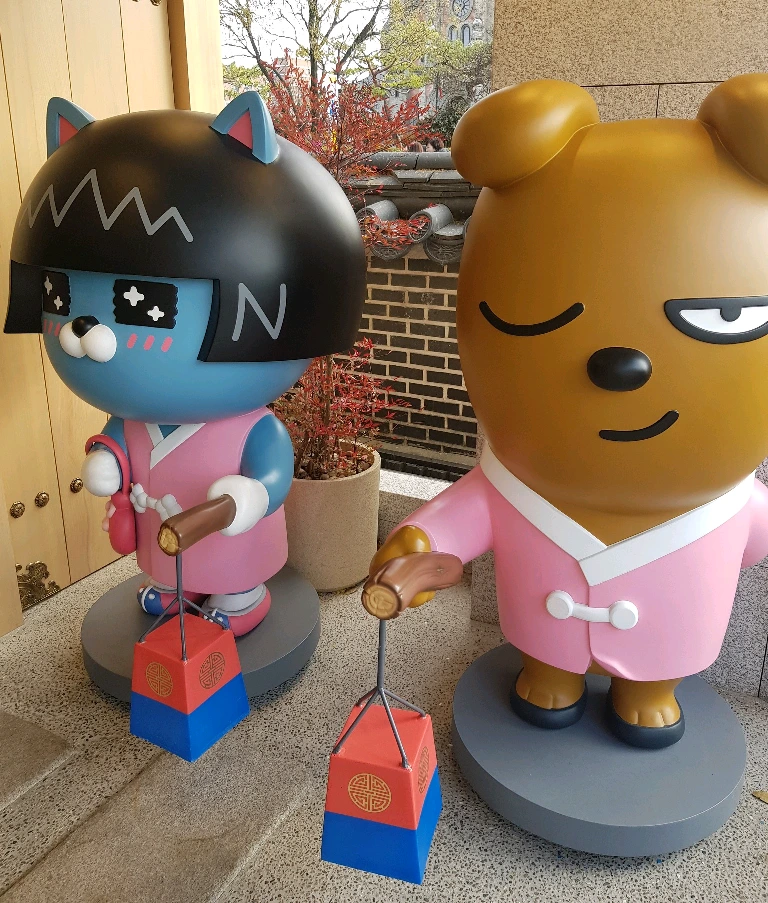 버스정류장에서 내려 조금 걷다 보니 한옥마을의 시작을 알리는 '카카오 프렌즈샵'을 만날 수 있었다. 원래도 좋아하는 캐릭터들이긴 하지만 전통적 모습을 반영한 카카오 캐릭터들은 더 귀엽게 느껴졌다