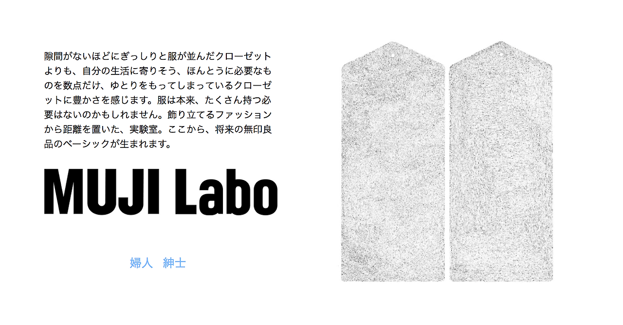 반면 다이스케 오바나와 호리우치 타로가 주도하는 MUJI Labo의 콘셉트부터 살펴보자면, 생각보다 우리가 필요 이상으로 많은 옷을 가지고 있을 수도 있다는 생각을 시작으로 여유 있는 옷장을 추구한다. 화려한 패션에서 거리를 둔 다음 기본으로의 발전을 목표로 하며 월별 옷가지 테마를 정하고, 반년 만에 옷장 전체가 완성하는 형태로 매월 신선함을 전달하고자 한다.