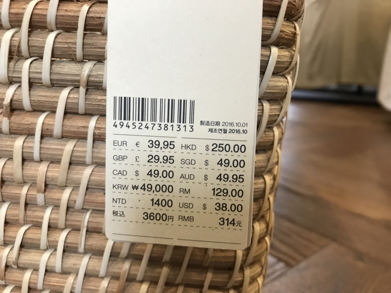 무인양품 제품 택 중 일부는 글로벌 프라이스 택이다. 달러, 엔화, 원화, 위안, 유로 등 약 10가지의 화폐 단위로 가격을 표기해두었다. 판매자 입장에서는 다소 곤란한 상황이 발생할 수도 있는 것이다. 특히 한국처럼 무인양품이 비싸다는 인식이 있는 경우에는 더더욱 말이다. 하지만 그런 택을 사용하는 이유는, 무인양품이 그 택 안에서도 세계의 여러 나라의 가격을 최대한 비슷하게 맞추고자 하는 노력이 있기 때문이다.