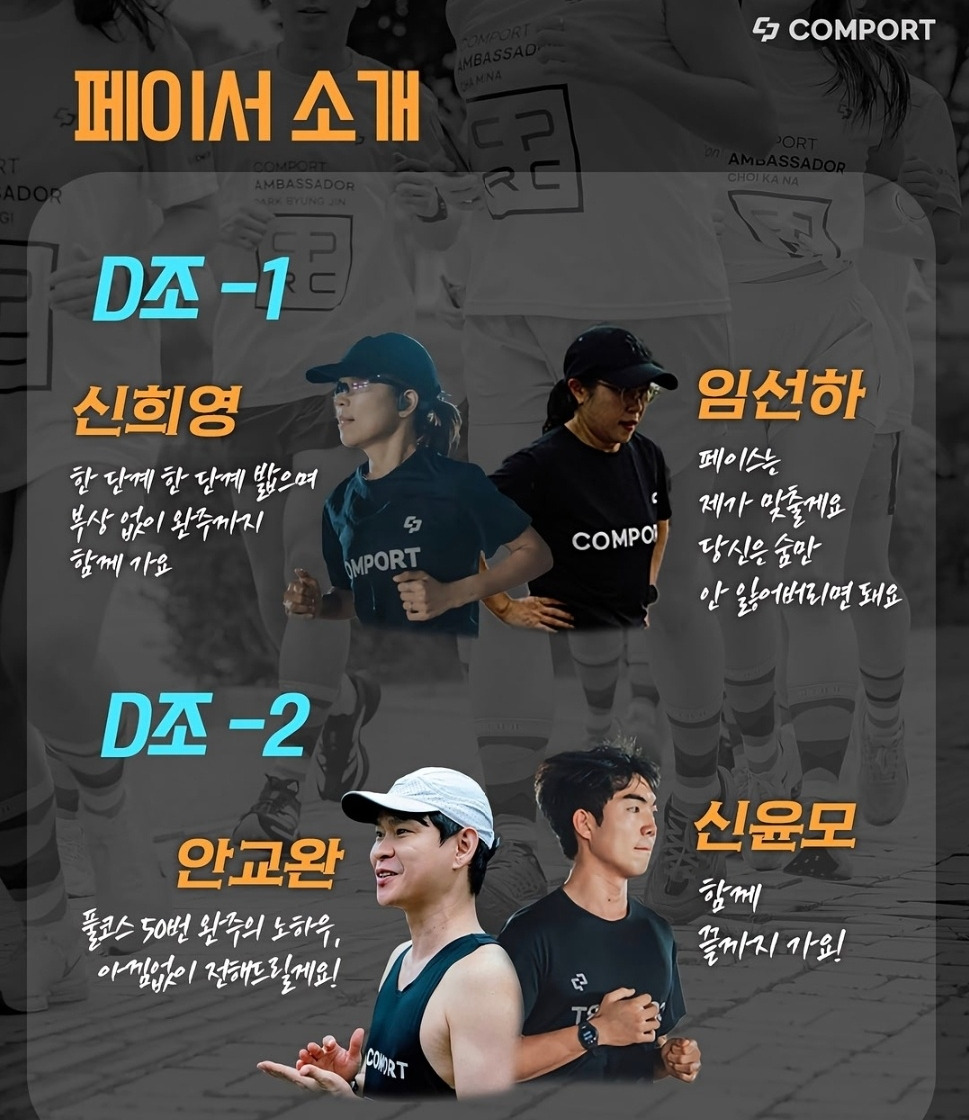 “항상 훈련만 참여하다가 이번에 컴포트 동마세션에서 ‘페이서’를 하게 되었어요. 훈련 참가자 여러분~~ 페이스는 제가 맞출게요. 여러분은 숨만 안 잃어버리면 됩니다.”