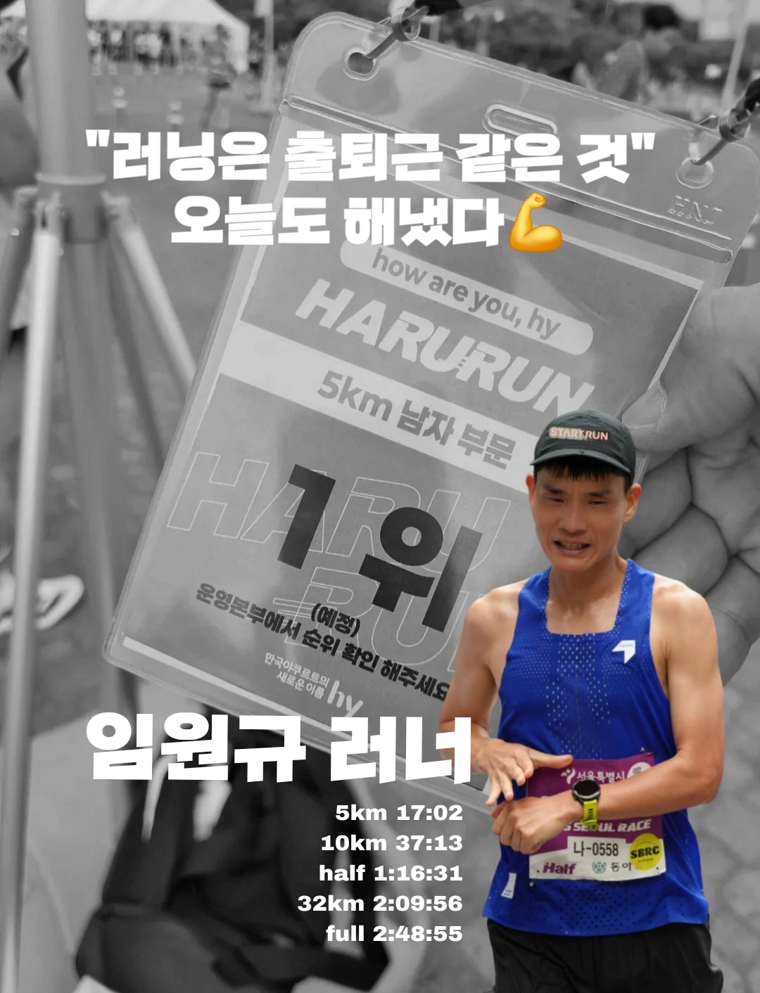 임원규 러너는 2023년 10월, 마블런(10K 49분22초)으로 러너로서 첫 대회를 치렀다. 그때의 나이가 40대였으니 러닝계에 늦바람이 든 셈인데, 그의 성장세는 무서우리만큼 가팔랐다. 바로 다음해인 2024년 같은 대회에서 37분13초로 12분가량을 앞당겼기 때문이다. 그리고 올해 마블런에서는 하프로 1시간19분16초를 기록했다.