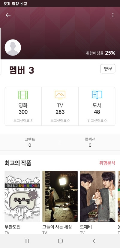 어느 날, 유튜브를 공동 운영하는 친구들에게 서로 왓챠 팔로우를 하자고 했다. 그런데 무심코 본 취향매칭률 결과가 좀 당황스러웠다.