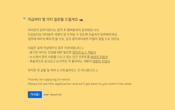 중간에 생략한 스토리인데, 현곤이한테 연락하기 전에 8월쯤에 지원서를 넣었었거든. 그땐 논스 지원서를 구글폼으로 내는 형식이었는데, 굉장히 많은 내용을 요구했어. 문득 논스 쪽에서는 알려주는 게 없는데, 내 정보는 너무 많이 요구하는 느낌이 드는 거야.