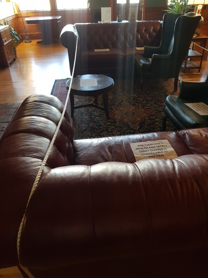아우터뱅크스 호텔 로비. '모두의 안전을 위해 로비 소파 이용이 불가하다'라고 쓰여 있다.