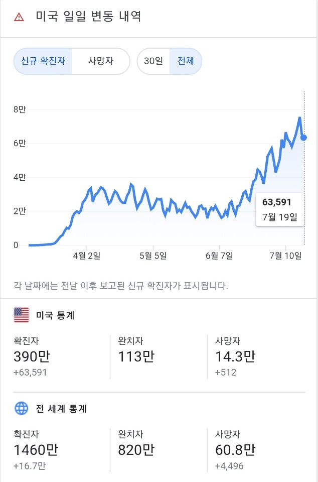 사실 내가 사는 채플힐 주변에서는 영화관도, 실내 놀이터도, 미용실도 아직 문을 열지 못하고 있다. 술집 등도 마찬가지다. 앞서 언급했다시피 식당 내 식사는 여전히 불가능하다. 아파트 수영장은 철저하게 신분증 검사를 하면서 외부인의 출입을 막고 있다. 이처럼 한국보다 더 강하게 방역을 하는데도 코로나19 확산 세는 잠깐 주춤하더니 다시 가파르게 상승 중이다. 트럼프 미 대통령은 “검사수가 늘어났기 때문”이라고 하지만 야구의 하이 패스트볼 같은 곡선을 그리는 그래프를 보자면 한숨만 절로 난다.