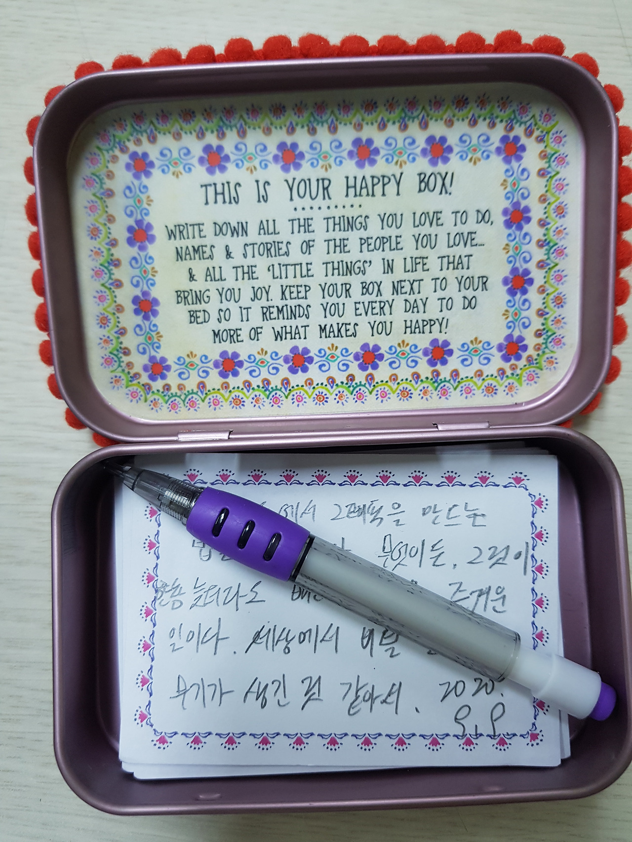 이것은 행복상자다. 네가 사랑하는 모든 일과 네가 사랑하는 사람들의 이름과 이야기, 그리고 네게 기쁨을 주는 아주 작은 모든 것까지 써라.