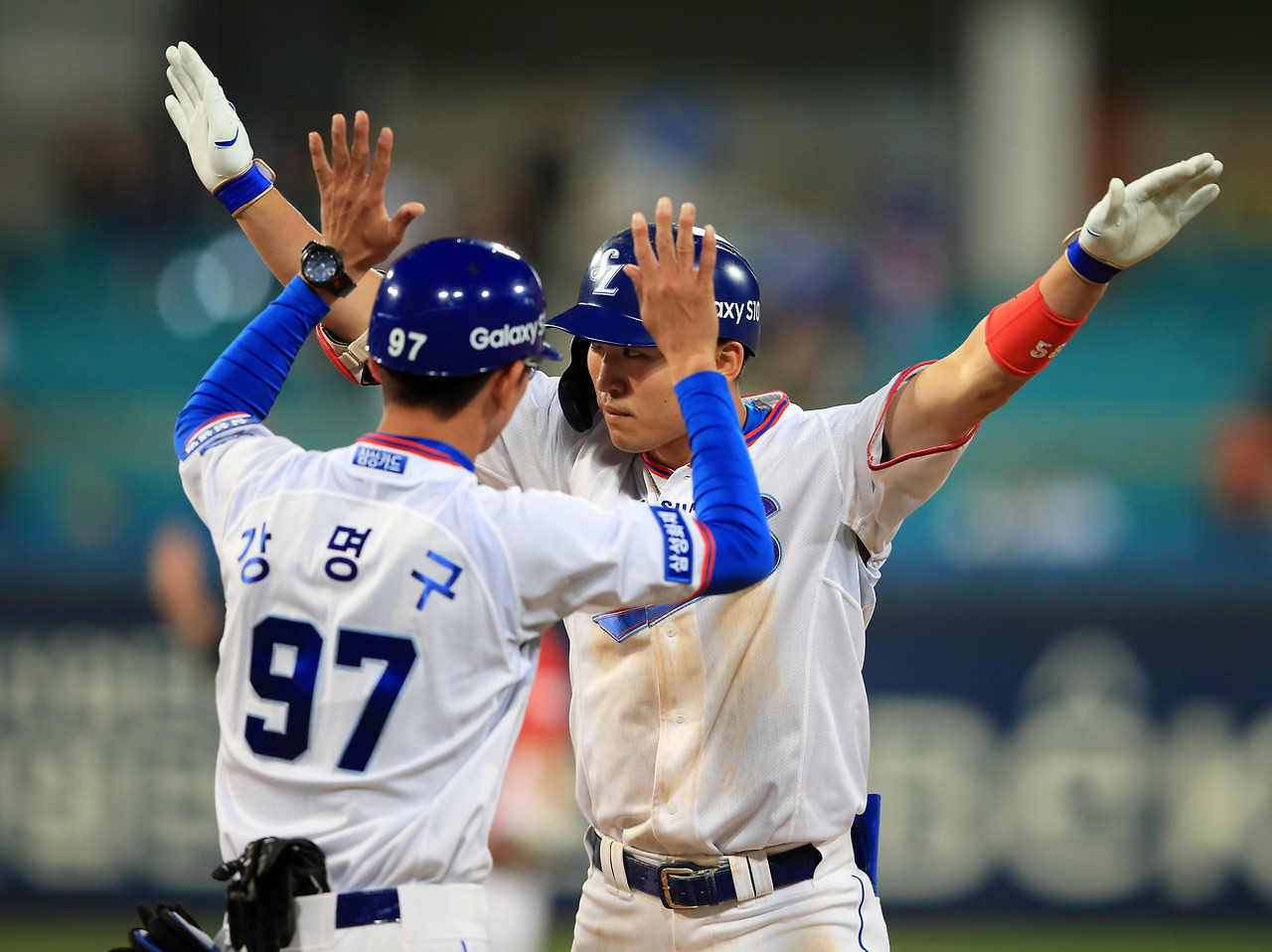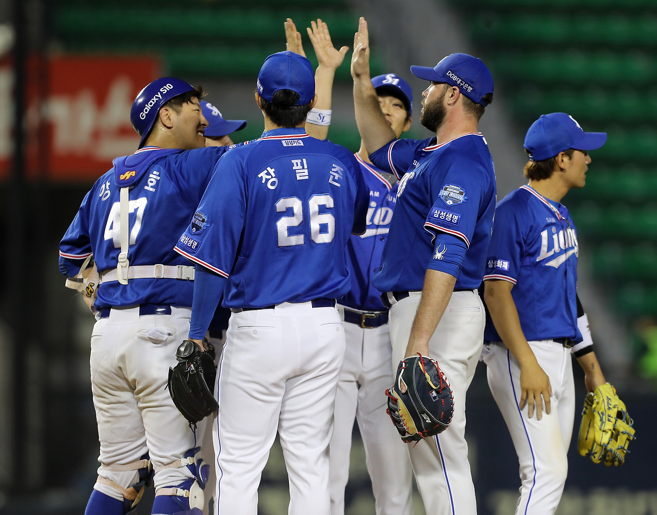 12일 잠실 LG 트윈스와 경기에서 승리한 뒤 하이파이브를 하고 있는 삼성 선수들. 삼성은 이날 경기 승리로 4연승을 달렸다. 삼성 라이온즈 구단 제공