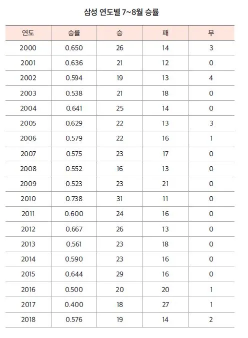 구단 역사상 최초로 정규리그 9위로 추락했던 2016년(승률 0.455)에도 7~8월에는 20승20패1무(0.500)를 기록했다. 2010년에는 31승11패(승률 0.738)로 승승장구하면서 정규리그 2위에 올랐다. 7~8월 승수를 빼면 삼성의 2010시즌 성적은 48승41패2무(승률 0.539)였다. 여름의 질주가 사자 군단의 2위를 이끌었다고 하겠다.