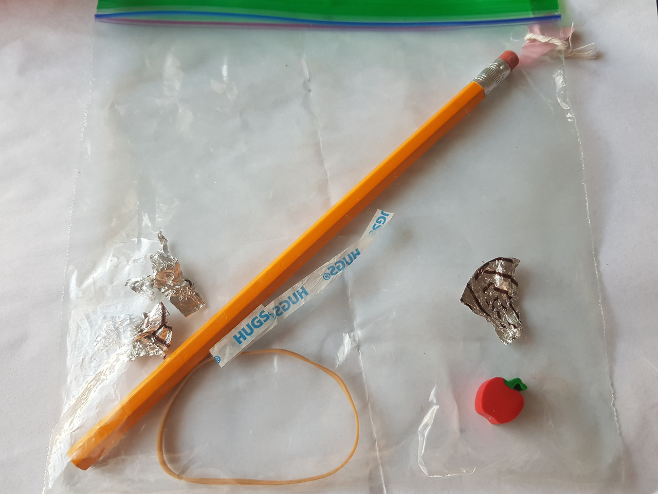 비닐봉지 안에 들어 있던 것은 연필과 작은 지우개, 고무줄, 그리고 아이가 먹은 키세스 초콜릿 껍데기. 초콜릿을 감쌌던 종이엔 HUG(안아주기)라는 글자가 있다. 허그는 올해 만약을 위해 필요한 것이라고.