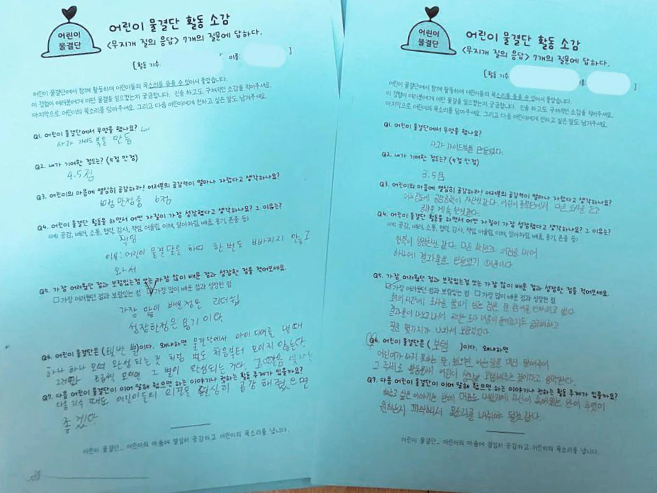 -어린이 물결단은 모두를 위한 것이다. 왜냐하면 이걸 하면서 어린이들이 많이 참여를 하고 좋아하기 때문이다.