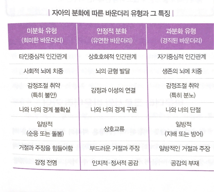 영향에 취약하다는 점을 '바운더리'라는 개념으로 이해해보려고 한다. <문요환의 관계를 읽는 시간>에서는 바운더리란 인간관계에서 나와 나 아닌 것을 구분해지는 자아의 경계이자 관계 교류가 일어나는 통로라고 정의한다. 저자는 자아의 진짜 모습은 혼자 있을 때가 아니라 관계 안에서 바운더리라는 형태로 그 실체를 드러낸다고 설명한다. 바운더리는 사람이 태어나 어린 시절 양육자와의 상호작용 속에서 개별화 과정을 통해 형성되는데 바운더리에 문제가 생기는 경우는 주로 애착손상으로 인해 자아발달에 문제가 생기거나 인간관계의 교류에 왜곡이 일어날 때 생긴다. 바운더리 유형은 희미한 바운더리 유형(미분화), 유연한 바운더리 유형(안정적 분화), 경직된 바운더리 유형(과분화)으로 분류되는데 이 중저학년 어린이들이 영향력에 취약하다는 점은 희미한 바운더리 유형과 경직된 바운더리 유형이 영향을 어떻게 주고 받는지로 바라보면 이해가 가능해진다.