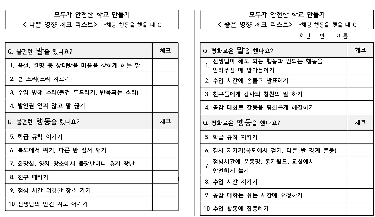 건강한 경계가 있다는 말은 영향을 선택하여 받아들인다는 것이다. 나와 다른 사람에게 어려움을 준다면 선택하지 않고 거절한다. 나와 다른 사람에게 도움을 준다면 선택하고 받아들인다. 영향 알아차리기와 영향 선택하기는 더불어 살아가는 안전한 공동체를 형성하기 위한 '경계 만들기' 연습이다. 아래의 체크리스트에서는 나쁜 영향과 좋은 영향이라는 분류기준으로 학교에서 주로 일어나는 어린이들의 반사회적 말과 행동과 친사회적 말과 행동을 분류하여 보았다. '나쁜 vs 좋은'이라는 분류 대신에 사용할 수 있는 다른 분류 기준을 제안하자면 '불편한 vs 편안한' , '불편한 vs 평화로운' , '어려움을 주는 vs 도움을 주는' , '거친 vs 친절한'이 있다.
