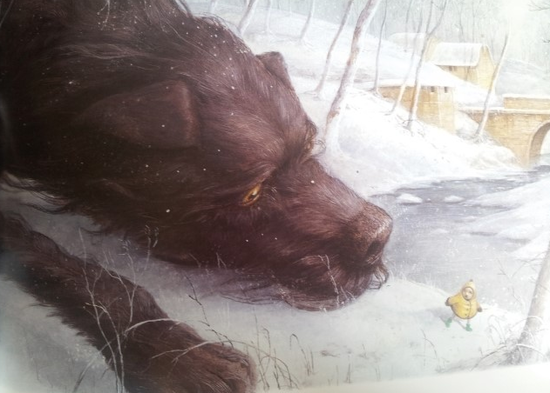 그렇게 작아진 검둥개를 본 가족들은 검둥개가 덜덜덜 떨만큼 어마어마하게 크지도 무시무시하지도 않다는 걸 알고 기뻐한다. 난롯가에 모여있는 가족들에게 꼬맹이는 말한다.