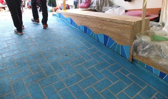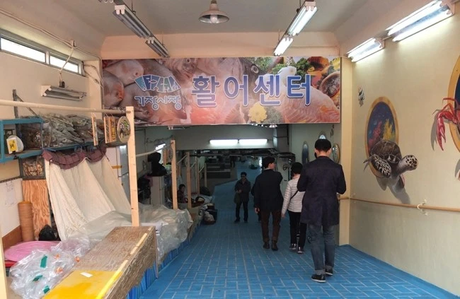 그래서 저희가 방문했을 때 골목형시장 육성사업에 선정된 부분은 사람이 다니는 길에서 건물 반지하로 내려가서 있는 활어센터였습니다. 기장시장 블로그(http://blog.naver.com/gijang-market)에서 본 내용을 토대로 찾아본 리뉴얼 된 부분들은 기장시장 BI와 바다느낌이 나는 바닥, BI의 그래픽모티브를 응용한 벽면이나 평상 디자인, 그리고 고객쉼터와 전체 활어센터의 상가 간판들이었습니다.