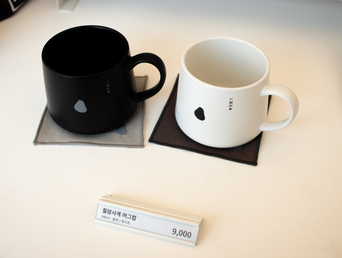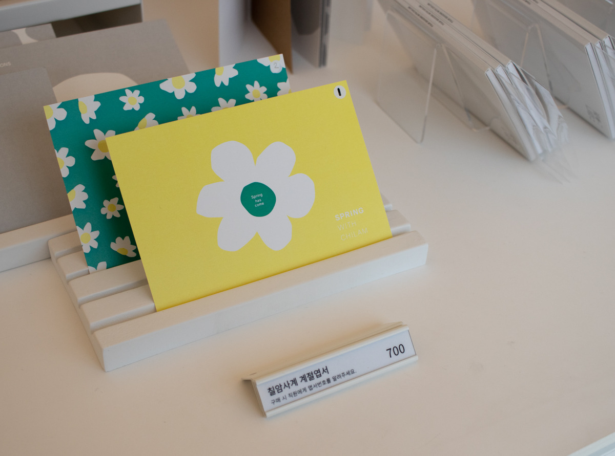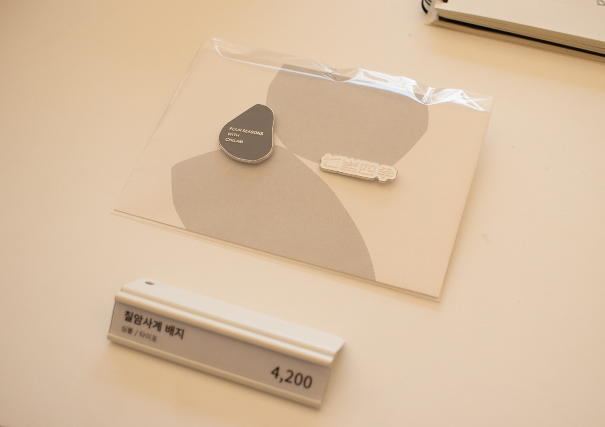그리고 굿즈류는 일반적인 엽서, 스티커 외에도 커피와 베이커리의 특성을 살린 텀블러, 테이블 매트, 에코백 등을 활용하여 커피와 빵이 함께 하는 라이프스타일에 대해서도 다양한 방식으로 제안하고 있었다. 여느 카페가 그러하듯 빵과 커피가 함께 하는 순간 가장 먼저 떠오르는 브랜드가 되길 바라는 브랜드의 바람이 느껴지면서도 단순히 유행하는 아이템이 아니라 칠암사계의 무드에 잘 어울리는 디자인과 소재를 활용한 제품들이라 소장욕구를 불러일으킬 만큼 퀄리티가 높았다.
