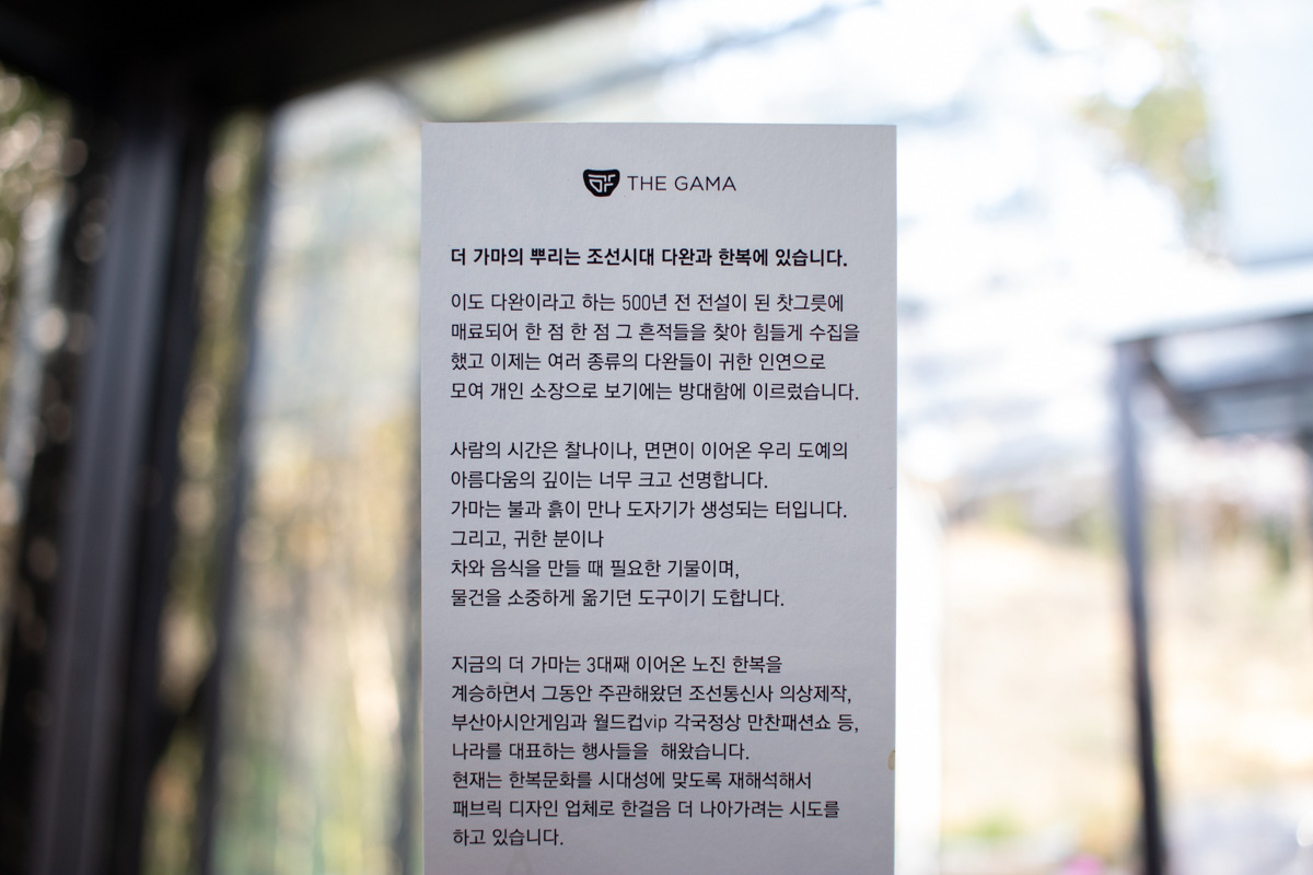 더 가마는 처음에 단순히 전통차를 마실 수 있는 공간인 줄 알았는데 실은 범일동에 위치한 노진 한복과 깊은 연관이 있는 브랜드였다. 홈페이지 소개에 따르면 더 가마는 조선시대 다완과 한복에 뿌리를 두고 있으며 오래전부터 '다완'이라는 전통 차 그릇에 매료되어 한 점, 두 점 모으기 시작한 것이 단순한 개인 소장으로 보기에는 그 양이 방대하여 지금의 더 가마를 열게 되었다고 한다. 또한 더 가마는 3대째 이어져 온 역사가 있는 한복 브랜드인 '노진한복'을 계승하며 한복문화를 시대성에 맞게 재해석하여 전통을 이어가는 패브릭 디자인 업체이기도 하다고 한다.